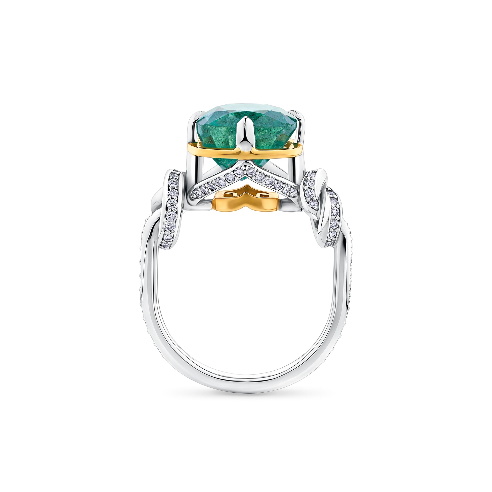One of a Kind 4.96ct Emerald Forget Me Knot Cushion Cut ring in 22ct Yellow Gold & Platinum