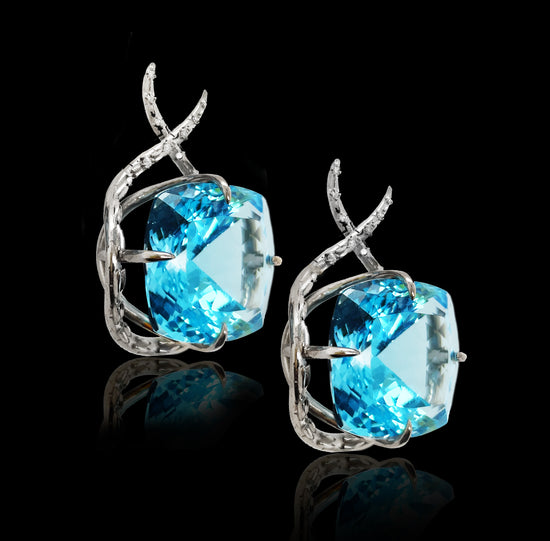 TYLA is a fantasy in one of a kind Ohliguer Croc Tail earrings featuring over 70cts of vibrant blue Topaz & diamonds.