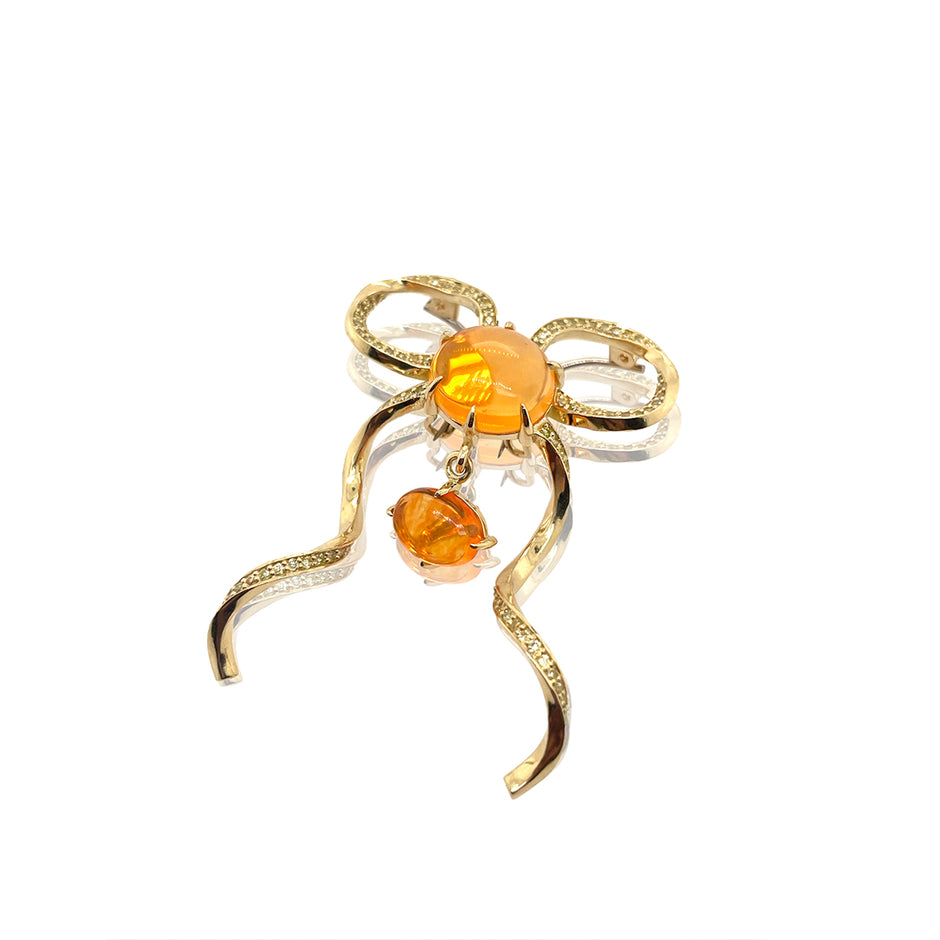 One of Kind Knot Brooch Bow Pendant with Fire Opal and Yellow Diamonds