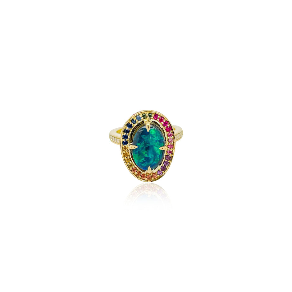 Black Opal & Rainbow sapphire and diamond ring in 18ct yellow gold