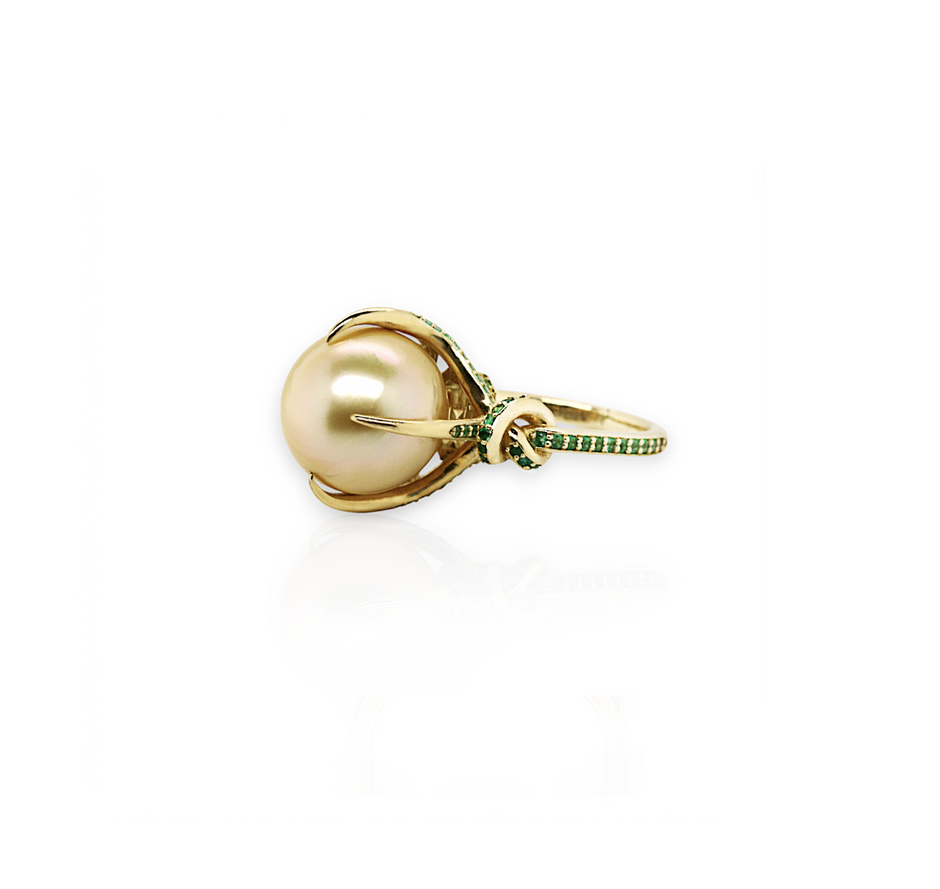 One of a Kind Golden South Sea Pearl & Emerald Forget Me Knot Ring in 18ct Yellow gold